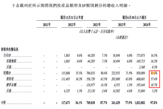 根据公司招股书披露,2024年上半年,公司约81.3%的收入来自于授权IP,主要是奥特曼和变形金刚,分别占同期收入的57.4%和18.7%。
