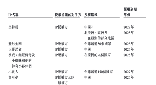 招股书显示,奥特曼IP中国授权到期年份为2027年,北美洲、欧洲及在亚洲的部分地区授权到期年份为2025年。变形金刚IP在全球超过50个国家的授权到期年份为2028年。